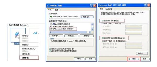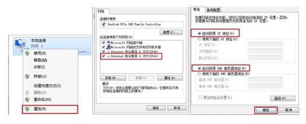 点击“开始-控制面板-网络和Internet-网络和共享中心-更改适配器设置-本地连接”,右键单击“本地连接”,选择“属性”。按照下图的信息将本地连接的信息设置为“自动获得IP地址”和“自动获得DNS服务器地址”,设置完成之后点击“确定”。