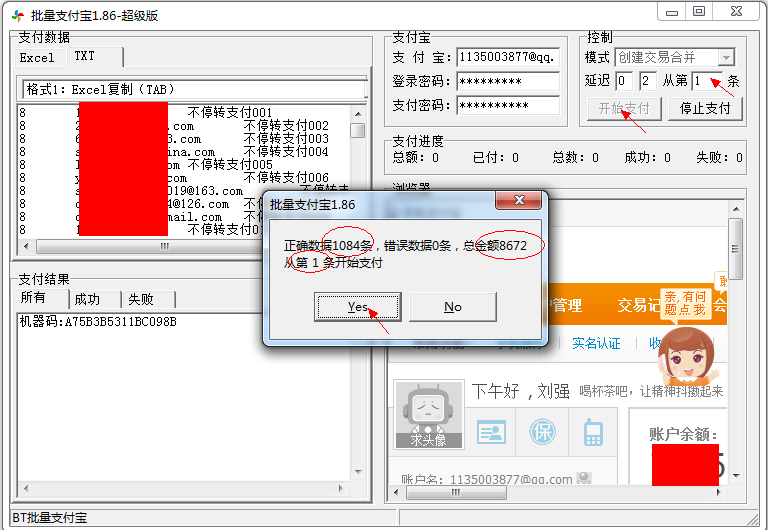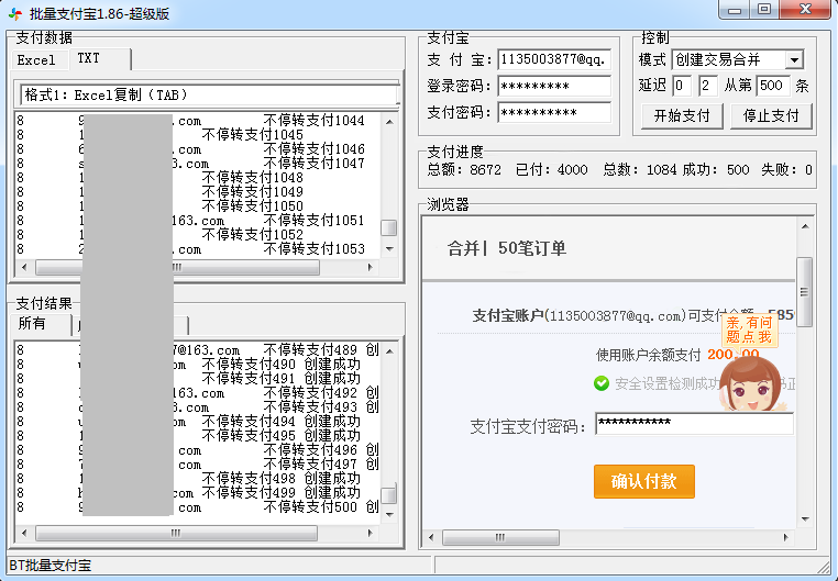 支付宝批量转账完全自动,不用打验证码,整个过程无需人工干预 可以选择Excel导入或者多种TXT格式复制支付数据,更方便,更快捷 免费支付流量检测,支付宝没有免费流量自动暂停支付 可以选择不输入支付密码完成批量支付,账户更加安全 还有很多好用的功能哦。【软件特点】