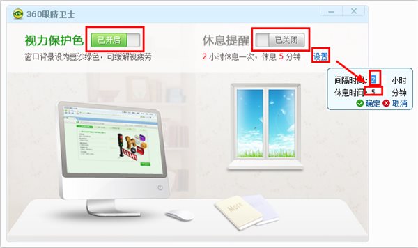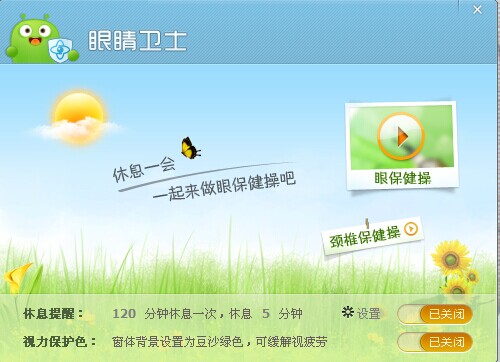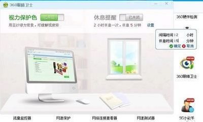 眼睛是我们看世界的窗口,没有了眼睛,我们就无法感受光明。所以,维持一个健康的视力水平是很有必要的。但对于成天对着电脑的上班族,以及将玩电脑游戏为主要娱乐的小朋友们来说,用眼过度几乎是通病,在工作学习压力之下,保护眼睛似乎成了奢望。360眼睛卫士是上班族们保护视力的最佳助手,主要作用就是定时提醒你休息,让你的眼睛不再处于长久的疲劳状态。软件的使用方法也超级简单哦,只要点开启就可以启动护眼软件,开启后窗口背景就会设置成豆沙绿色,可以缓解眼睛疲劳,同时还会有贴心的休息提醒,提醒时间可以自已设置。360眼睛卫士,合理作息,健康生活,智能健康提示,定时提醒,健康生活伴您每一天。