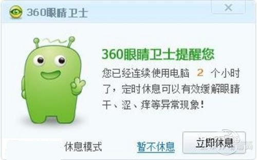 5、当到了设定的休息时间,360眼睛卫士的安仔会自动弹出让你休息,当然,如果手头真的有非常必要的事情可以选择暂不休息。当点击立刻休息,则会跳出一款Q版眼睛保健操演示图,可谓让人重温了儿时的记忆,每天课间那清脆的声音:“眼保健操,现在~开始~~第一节,按揉睛明穴”……