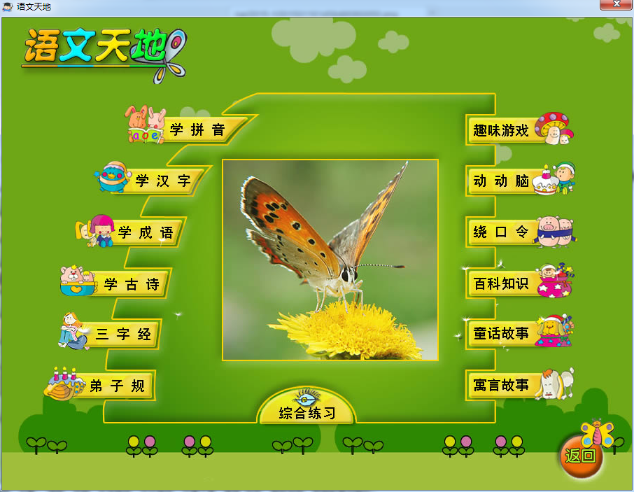 本模块囊括语文众多知识,包括:学拼音、学汉字、学成语、学古诗、三字经、弟子规、趣味游戏、绕口令、百科知识、童话故事、寓言故事及语文类的综合练习。这里,每个模块的内容,是那样丰富而多彩,详细和完整,使用后,你会发现,原来所有的内容,是那样浑然一体……汉字与词语的发音,均采用标准普通话,每个模块的学习中,采用的动画形象生动,设计的练习丰富而多样,易于帮助小朋友快速记忆与提高所学知识。用于思维的常识学习,题型众多,可充分发掘和挑战孩子们的想像力。