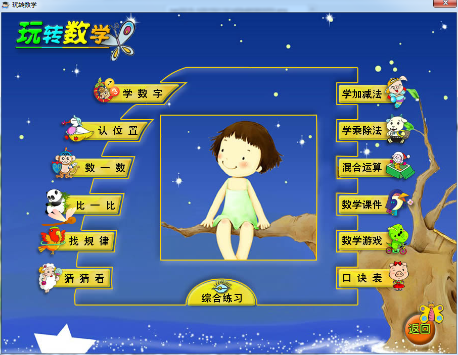 本模块囊括数学启蒙的众多知识,包括:学数字、认位置、数一数、比一比、找规律、猜猜看、学加减法、学乘除法、混合运算、数学课件、数学游戏以及数学里面的综合练习等。玩转数学中的每个模块,我们都结合少儿思维开发,通过“易学易用善思维”的儿童学习要点,精心设计与制作,每个模块的内容练习,都重在兴趣的培养,思维的养成。