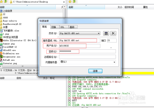主要输入3个内容,服务器地址、用户、密码。端口默认为21,一般不用修改。