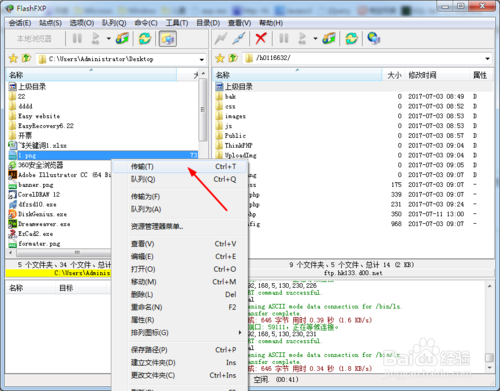 现在要上传文件到服务器上,也就是把左侧的文件传到右侧中。在左侧目录中找到要上传的文件。右击鼠标选择第一项【传输】