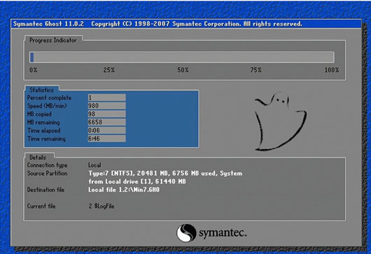 6、当电脑屏幕出现类似以下画面的时候,说明系统已经再开始安装了,在安装过程中,谨记不要对键盘鼠标进行任何操作,更不要重启或者关闭电脑,否则将会导致系统安装错误,无法进入操作系统;如下图: