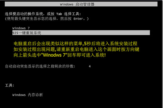 5、在点“是”重启电脑后,会出现一下界面,默认不需要任何操作,5秒后会自动进入安装界面