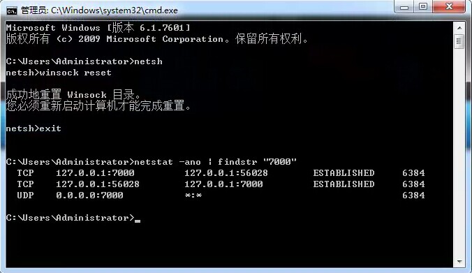 打开cmd,输入命令netsh,回车;→输入命令winsock reset,回车;→输入命令exit,回车;→输入命令netstat –ano : findstr “7000”,最后回车即可;(效果图如下)