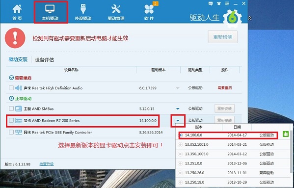 2.在安装并弹出的驱动人生软件里面,点击“本机驱动”,在显卡驱动列表选择最新版驱动进行安装更新即可,如果提示重启电脑则选择重启。