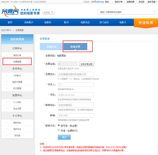 单击“申请发票”,填写相应信息,确保您填写的信息正确,带“*”项为必填项。