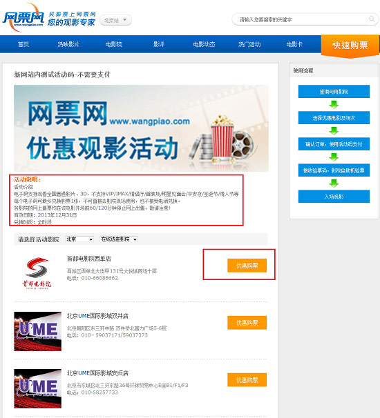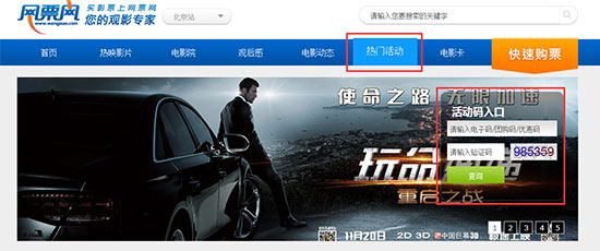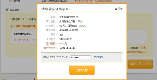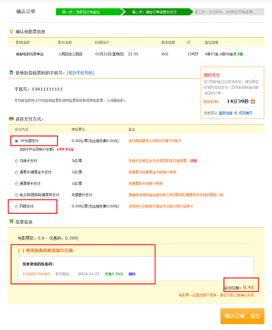 5、确认订单信息后,选择VIP余额或者网银支付,可享受优惠码带来的优惠。确认结算信息后,完成支付即可成功预定影票,持收到的验票码短信可打印影票入场观影