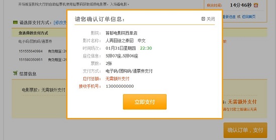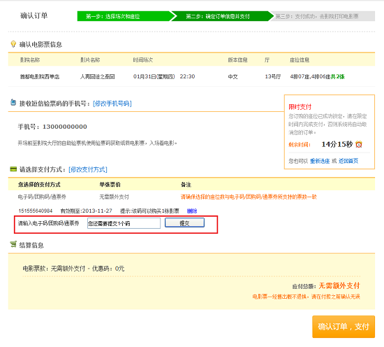 5、 确认订单信息后,请您填写对应座位数量的电子码,确认支付即可完成影票预定,持收到的验票码短信即可打印影票入场观影
