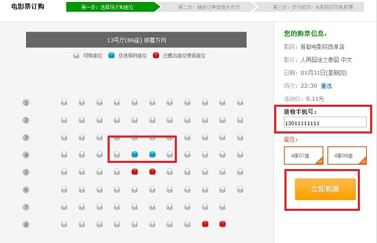 4、 点击“购票选座”按钮后,进入座位图挑选座位,填写手机号后提交订单