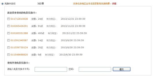 如已经绑定了兑换卡可从显示的兑换卡列表中,选择一张或多张兑换卡支付本次订单。(为了您更方便的管理卡片和购买影票推荐您绑定兑换卡)