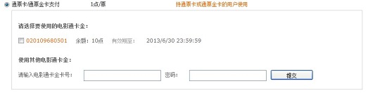 如已经绑定了通票卡可直接选择一张或多张通票卡支付本次订单。(为了您更方便的管理卡片和购买影票推荐您绑定通票卡)