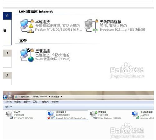6、检查本地连接。如果电脑中同时存在多个网络连接,如“本地连接”、“无线网络连接”、CMCC连接等,而与宽带MODEM相连的网络连接被禁用,进行宽带拨号时,也会提示错误678。因此出现错误678时还要查看本地连接是否被禁用,如果禁用,将本地连接启用,并提示本地连接已连接后,再尝试用宽带拨号连接。注意查看网络连接时各个操作系统不一样,XP系统可在电脑桌面右击鼠标,选择“属性”查看。VISTA、WIN7系统在网络和共享中心查看。