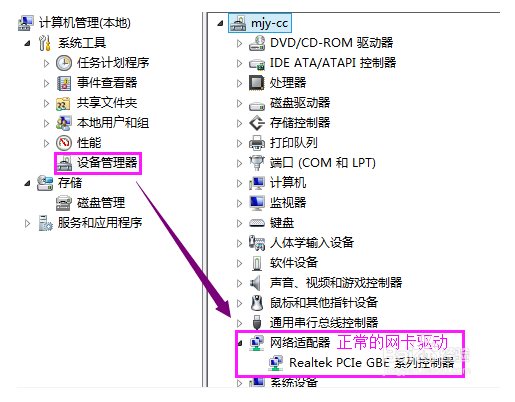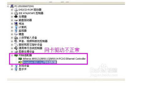 不正常的网卡驱动会在网卡上出现黄色叹号或没有检测到网卡。