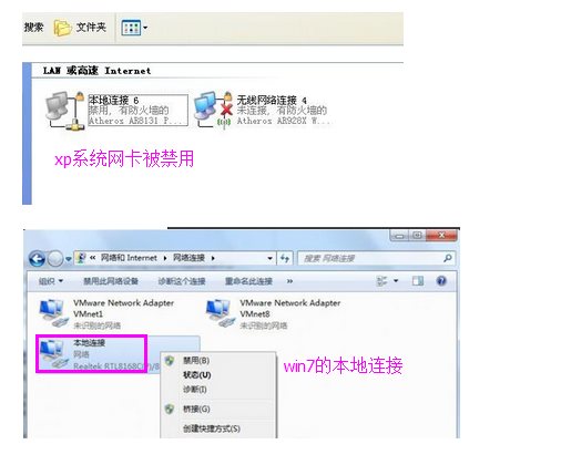 查看网络连接中的本地连接是否被禁用。不同的系统,本地连接的界面不太一样,但原理是一样的,查看一下本地连接如果禁用,则右键单击本地连接,选择启用即可。(下面是各种系统的本地连接界面)