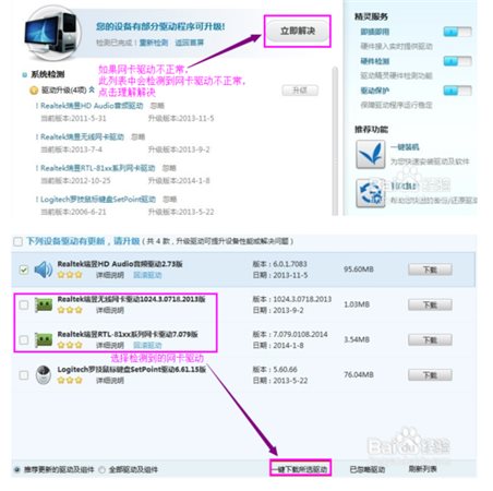 ③检测完毕会出现所有需要安装的驱动或有问题的驱动,点击立即解决。