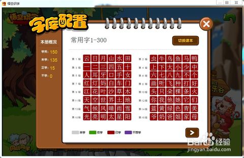 打开之后我们看到了,目前我们是在常用字1-300中学习!并且还有进度!这里我们学习了150个字,正在学15字,还有135个字未学,真是统计的好详细啊!