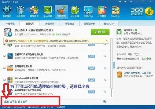 如果长期没有对系统进行垃圾清理,那么在C盘会产生各类垃圾文件,此类文章会占用大量C盘空间,这种情况我们建议大家使用360安全卫士或者金山卫士对系统垃圾进行清理,这里建议大家在使用清理工具为了可以尽可能清理掉系统垃圾,请选择全选。