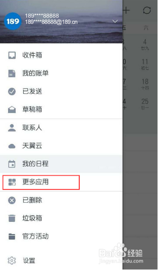 1.登录189邮箱客户端,进入首页,拉开选项列表,点击“更多应用”