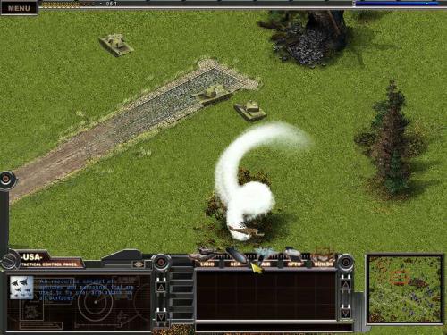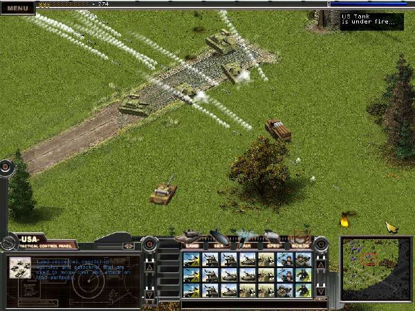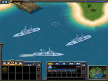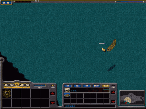 按照现有即时战略游戏的常规,第一关都是用来使玩家上手的,不用担心难度的问题。在战斗的开始时,我军备置有十几个机枪兵和两个火箭兵以及两辆运输车和六辆坦克,另外水上还有三艘巡洋舰也处于待命中。很快敌方就会用自杀船来撞沉你的战舰,这虽是程序安排,不过玩家控制得当的话,保留下一两只也是有可能的。分布好兵种,将装甲部队分布在步兵的两翼,只要在敌人来临时稍微调配一下人手就可以轻松完成任务。