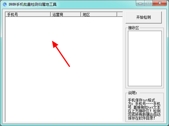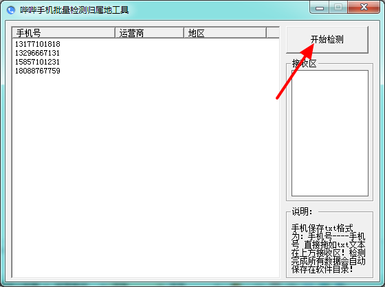 1、建立手机号为本,格式为:一行一个(软件说明文本有误)2、将手机号文本拖动空白地方,非接收区