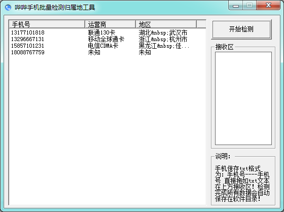 哔哔手机归属地检测工具是一款简单绿色的免费工具,它能够让你轻松查询手机号码的归属地等等信息,支持批量搜索,查询所得信息准确可靠,相信大家一定会非常需要的。