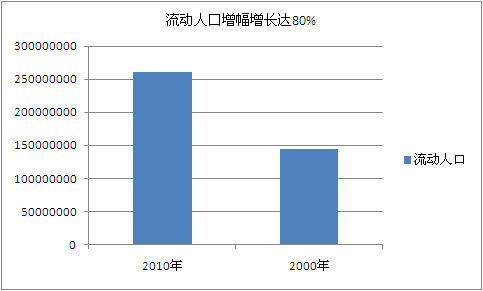 大陆31个省、自治区、直辖市的人口中,居住地与户口登记地所在的乡镇街道不一致且离开户口登记地半年以上的人口为261386075人,其中市辖区内人户分离的人口[10]为39959423人,不包括市辖区内人户分离的人口为221426652人。同2000年第五次全国人口普查相比,居住地与户口登记地所在的乡镇街道不一致且离开户口登记地半年以上的人口增加116995327人,增长81.03%。