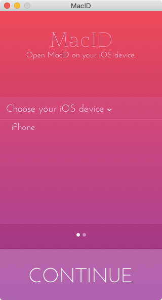 先从下拉菜单里找到你要配对的iOS设备,点击「Continue」,MacID需要获取解锁Mac系统的权限,所以你需要输入OSX账户密码: