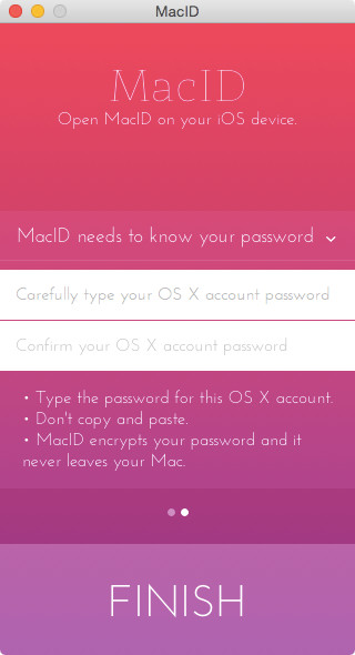 设置过程太简单了,考虑到曾未用过这类工具朋友的感受,小编还是仔细介绍一下,首先你要确保Mac升级到了Yosemite,安装了MacID客户端并开启了蓝牙,iOS设备升级到了iOS8,安装了MacIDforiOS并开启蓝牙模块。
