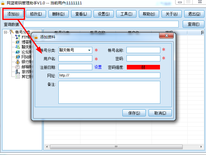 2、注册完成登陆账号进入主界面,即可对账号密码进行登记。