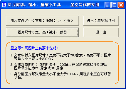 星空图片处理软件是一款小巧简单的图片处理工具。该工具界面简单,操作也非常简单容易,剪切、缩小、压缩等等基本图片处理功能皆有,还可简单快捷的使用,非常方便。