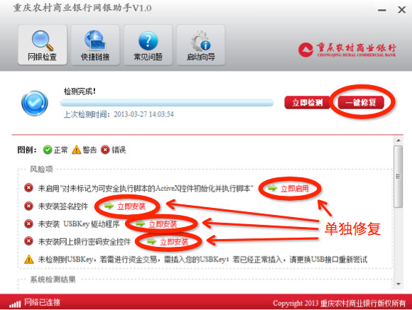 2.网银助手登录后会自动检测您的电脑环境是否符合我行网上银行,如下图所示,如果发现有风险项,请可以点击“一键修复”按钮进行全部修复,也可以选择其中部分检测结果进行单独修复;点击“立即检测”按钮可以重新检测您的电脑环境: