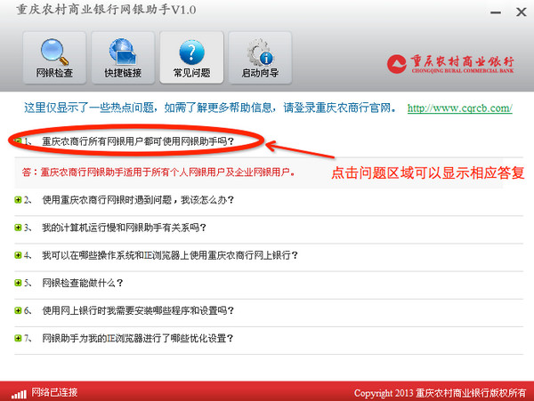4.点击菜单栏的“常见问题”按钮,可以进入常见问题界面,如下图所示,可以帮助您解答一些常见的问题,如果还不能解决您的问题,请拨打我行客服电话023-966866或4001-966866寻求帮助: