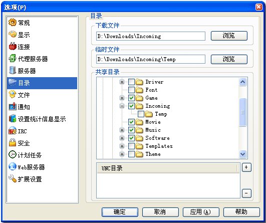 在eMule运行窗口的顶部菜单内点击“选项”按钮,然后在左边的方框内选中“目录”,右侧就可以自定义文件存放的路径(文件夹)了。如图: