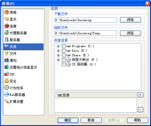 eMule 功能强大,我先把更改目录说一下。点菜单“选项”,再点“目录”,把“下载的文件”和“临时文件”两个目录选择到不是系统盘(一般是C:\盘)的分区,如 D:\emule\incoming和D:\emule\temp。下面还有一个共享目录,你可以选择你想共享的分区、目录或者文件,在前面打上钩就可以共享给其他电驴用户了。