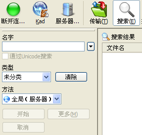 1、点“搜索”菜单,在“名字”里面输入关键字,“类别”可以选择任意(推荐方式)或者视频(无法搜索dat文件),“方法”最好选择“全局(服务器)”,然后点“开始”,你就会发现列出了n多可下载的符合你口味的视频文件。