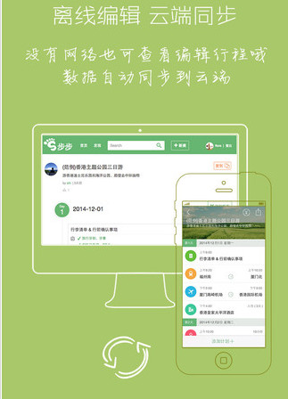 旅行在外,随时都有可能出现不能联网的问题,『步步行程助手』可以离线使用,不论是编辑还是查看行程,只有当用户连上网络的时候,才会将数据上传到云端的数据库,防止数据丢失。