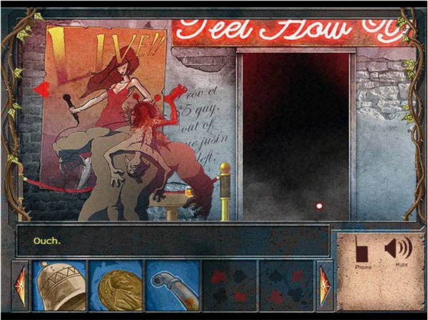 出门前往街道然后向右到酒吧门口,门口有人把守,有两种方法通过:第一种是先前在垃圾桶边上有一根铁管,可以用它直接把守卫揍扁;另一种是和另一边的小混混对话,用那枚硬币买下他卖的蘑菇,然后放进守卫的酒里面,转个身再回来,会发现守卫已被毒死。