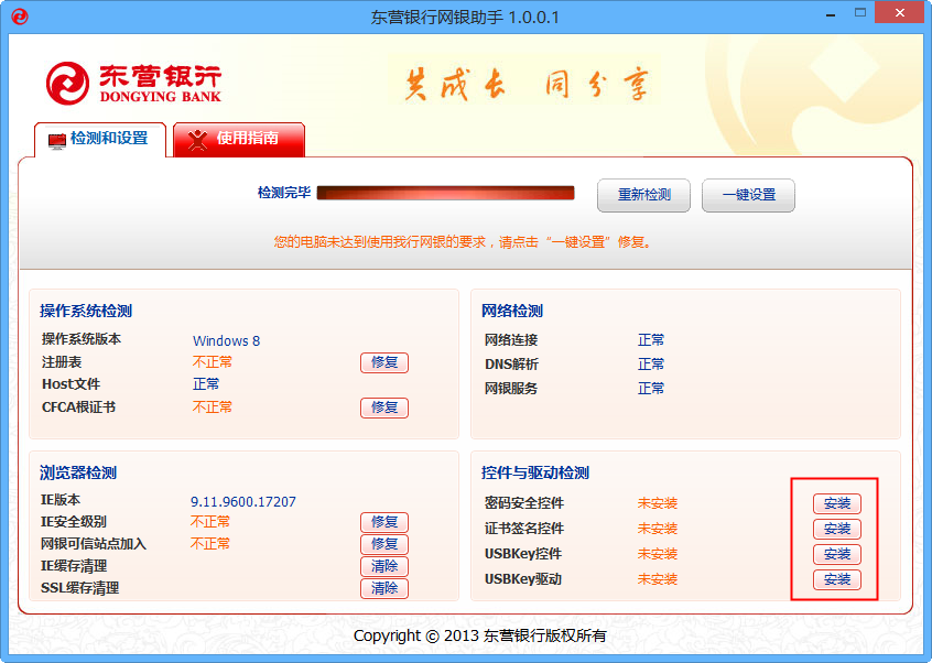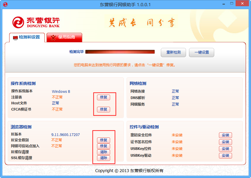 东营银行网银助手是东营银行官方发布的网银助手软件。该网银助手软件可以保护用户上网交易环境的安全性,保障用户账户安全,提高用户保护意识,有需要的可以下载。集成网银控件、UKEY驱动及管理工具、个人证书下载、证书签名控件等内容的客户端工具。当您启动网银助手后,该软件将自动进行在线检测、修复和升级,以确保驱动程序、安全控件和网银证书等一系列网银环境下需要的各类软件的正常运行,从而确保您更方便地操作使用网银。