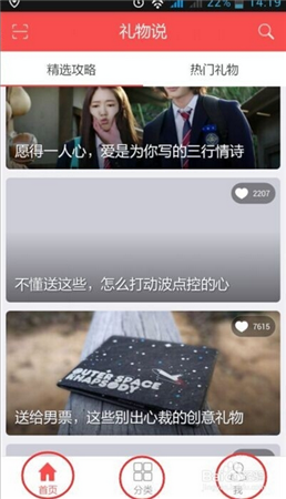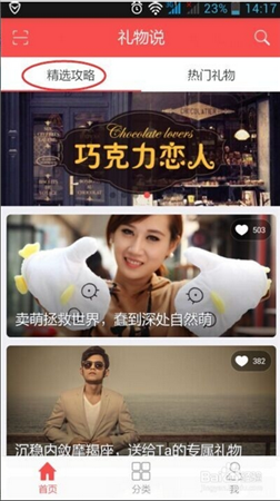 2、打开首页,页面比较简洁,文字配图,显得比较小清新。上面有两个选卡项,“精选攻略”和“热门礼物”