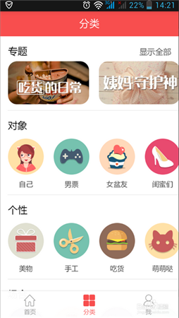 4、“首页”和“我”都没什么说的,就说一下分类吧,是以专题的形式呈现的,分类不是很多,但是清晰明了简洁,方便自己快速做出选择