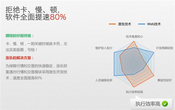 为保障行情和交易的快速稳定,涨乐财富通对行情和交易模块采用原生开发技术,速度全面提高80%。