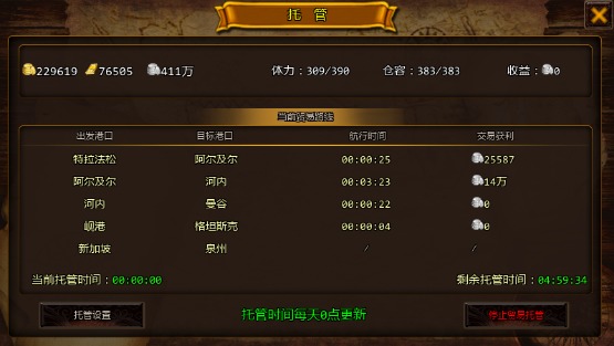 2. 点击【托管】,系统提示“贸易舰队已经进入可离线托管模式”,则托管已经开始。当你要中断托管时,可进入【托管】,点击【停止贸易托管】,系统提示“自动托管已经取消,您现在可以自由控制舰队了”,则托管立刻停止,贸易舰队停止航行。