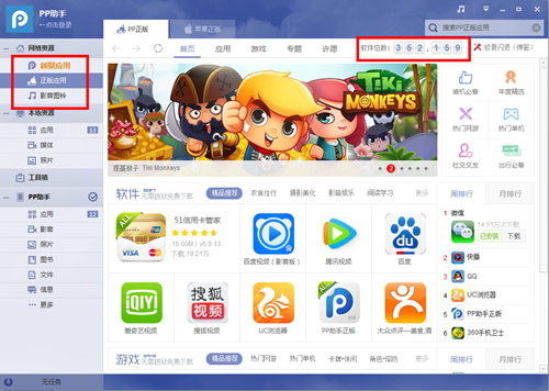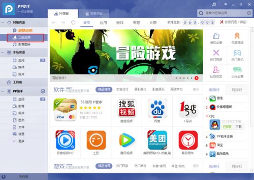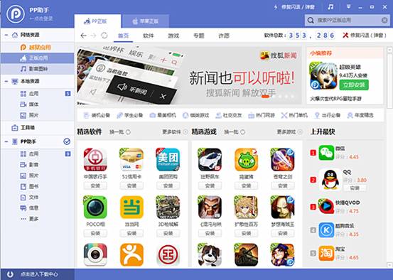 1、PP助手直观清晰的界面PP助手主界面囊括:重点推荐图、资源栏、最新专题列表、功能导航等,设计简洁明了,界面清新,给人春风拂面之感!