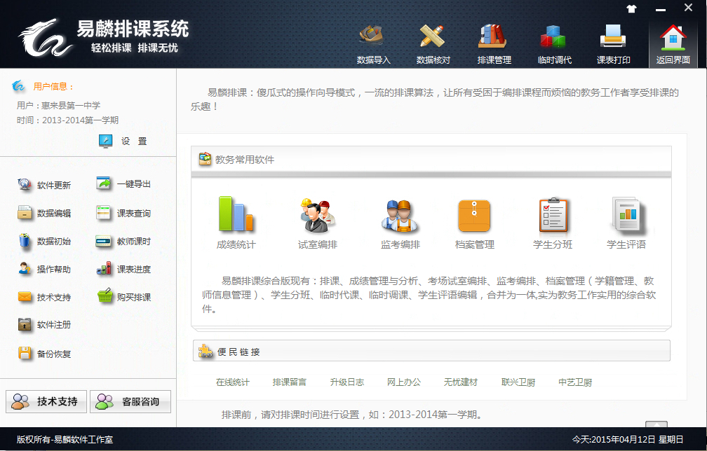 邻居教务统 综合有:排课软件、成绩管理与分析、考场试室编排、监考编排、档案管理(学籍管理、教师信息管理)、学生分班、临时代课、临时调课、学生评语编辑,合并为一使实为教务工作实用的综合软件。