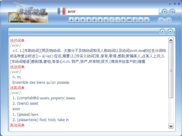 【法法解释,法英翻译,英法翻译,英汉翻译,法意翻译】与法汉翻译使用方法相同,如要切换词库可在软件设置功能中选择或直接点击文本栏左边的(国旗)按钮(快捷键Ctrl+P)。