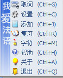 此工具独立于主程序,在安装目录中选择运行(开始/程序/我爱法语/单词复习)或从主程序菜单中选择‘复习’功能。可用于辅助用户复习,背诵法语单词,运行时在屏幕上方出现一个窗口条,滚动出现用户需要背诵的法语单词。鼠标移动到窗口上时滚动停止,点击窗口右侧圆形图标或在窗口任何处单击鼠标右键弹出选项菜单。用户在选择菜单中可选择所需背诵的词库、单词显示模式,滚动速度和顺序等功能。