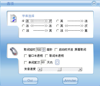 在选项菜单中选择‘设置’,出现设置窗口,可在此窗口选择翻译词库(,调整取词延迟时间,设置窗口透明度,是否在启动时出现单词复习窗口,调整单词复习日期和改变法语发音速度等功能。